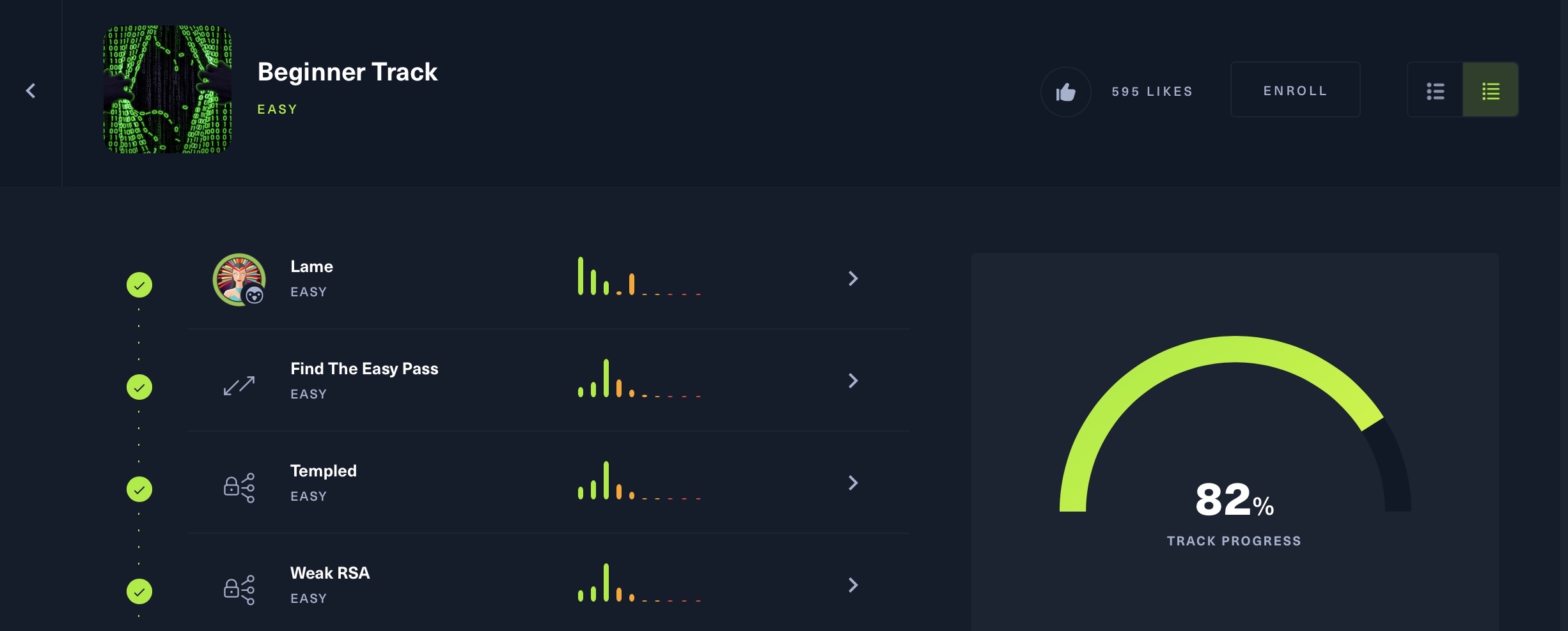 HTB Tracks est une fonctionnalité très pratique pour planifier vos prochains exercices et défis. Un parcours est une sélection d’exercices et de défis liés entre eux, permettant aux utilisateurs de progresser dans la maîtrise d’un sujet particulier. Que vous débutiez, souhaitiez tester vos compétences Active Directory ou soyez prêt à relever un défi du parcours Expert, vous trouverez un parcours adapté comprenant une vaste sélection d’exercices et de défis pour vous aider à perfectionner vos compétences dans un domaine spécifique. Les parcours sont créés par l’équipe HTB, des entreprises, des universités et même des utilisateurs. En cliquant sur un parcours, vous verrez tous les exercices et défis qui le composent, votre progression dans chacun d’eux et votre progression globale dans le parcours.
