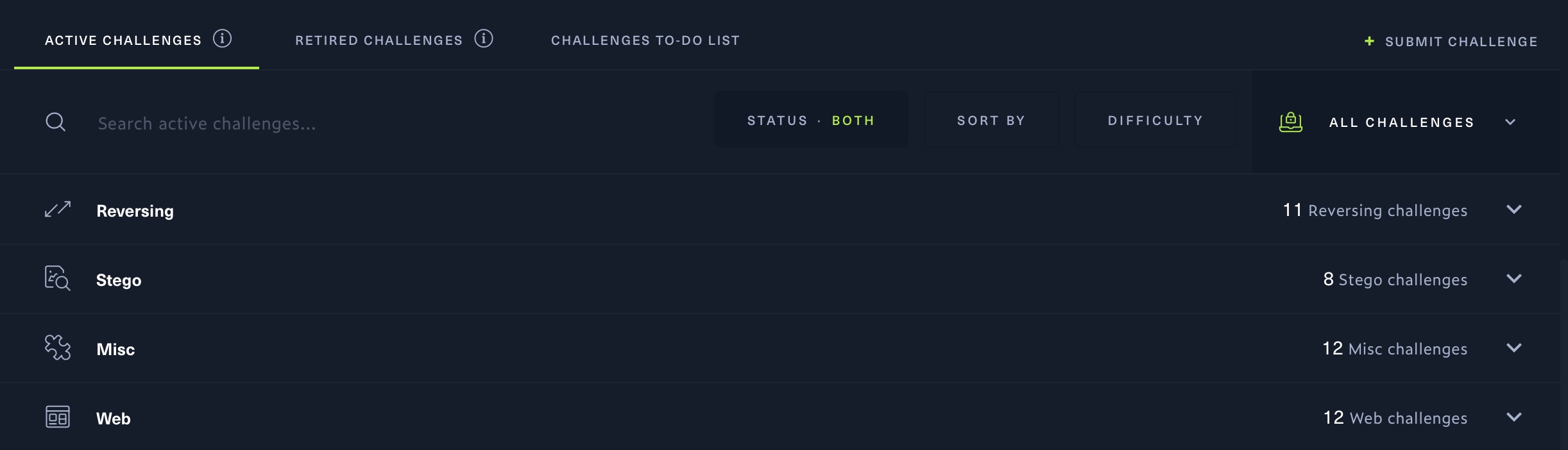 La page des défis présente une mise en page similaire à celle des machines. Vous y trouverez des défis actifs et retirés, répartis en dix catégories, chacune contenant jusqu’à dix défis. Cliquez sur une catégorie pour prévisualiser la liste des défis, puis sur un défi pour accéder à sa page et soumettre ses drapeaux.