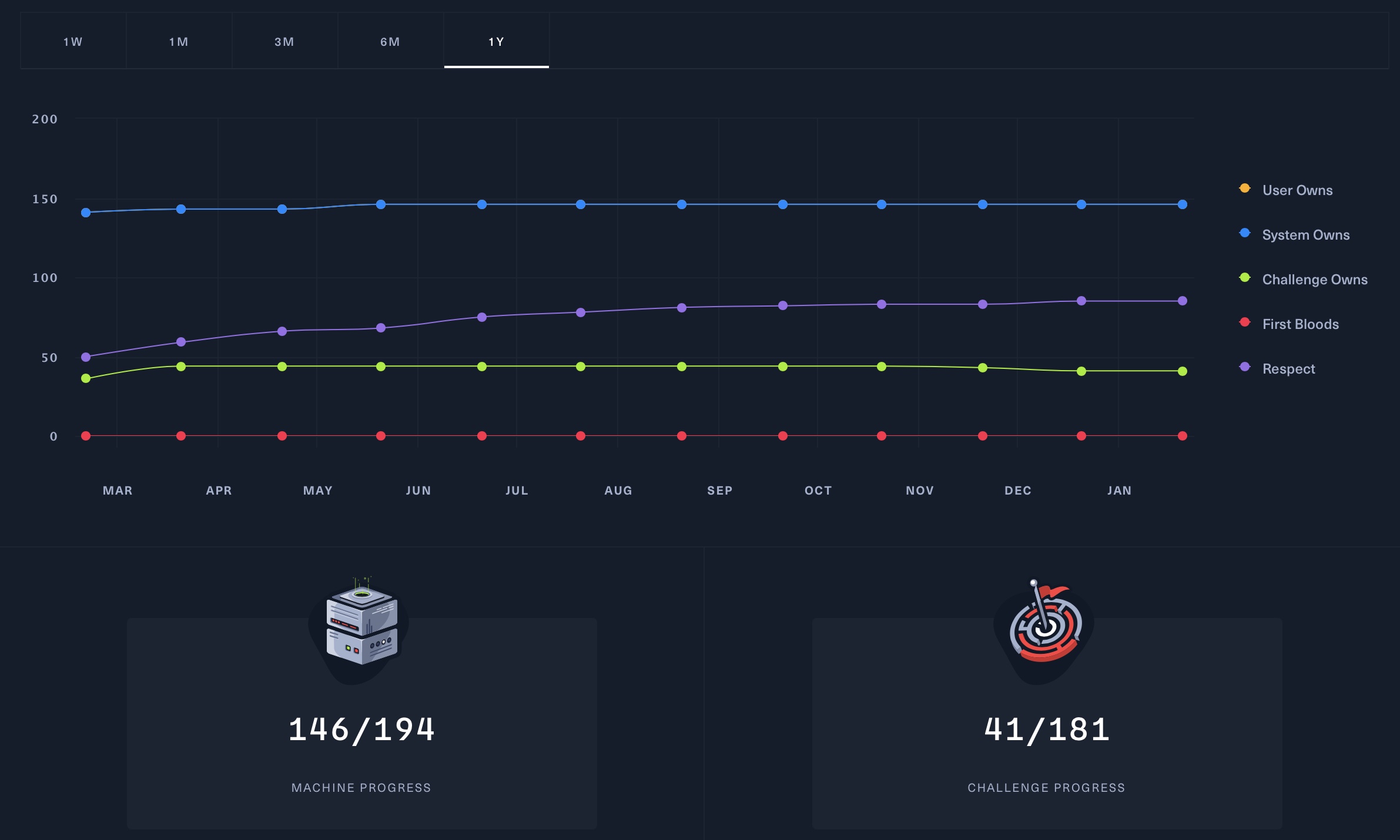 Votre page de profil affiche vos statistiques HTB, notamment votre rang, votre progression vers le rang suivant, le pourcentage de possession des différents défis et laboratoires HTB, et d’autres statistiques similaires.