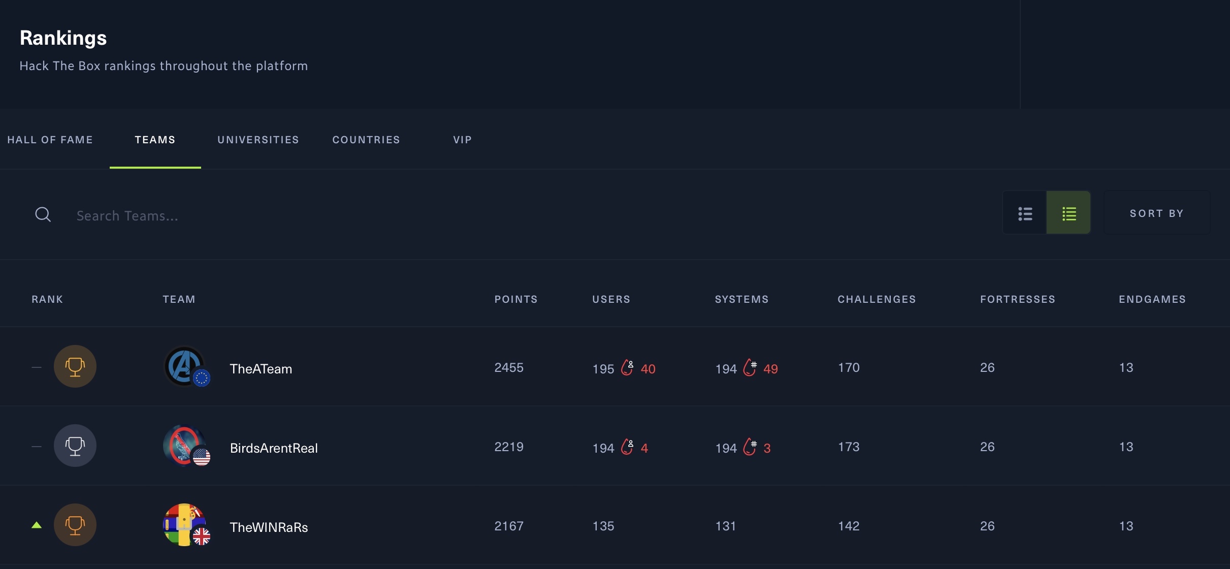 La page des classements HTB affiche les classements actuels des utilisateurs, des équipes, des universités, des pays et des membres VIP.