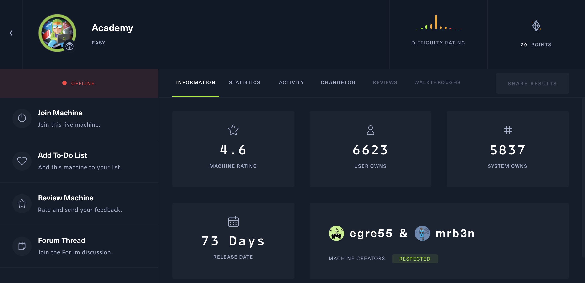 Vous pouvez filtrer les machines selon que vous les ayez terminées ou non, leur difficulté ou leur système d’exploitation. Vous pouvez également les trier par date de sortie, note ou difficulté évaluée par les utilisateurs. En cliquant sur une machine, vous accédez à sa page dédiée.