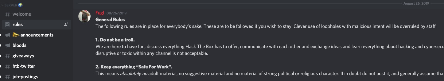 Un autre excellent endroit pour discuter des boîtes et des défis de Hack The Box, ainsi que de divers autres aspects du jeu, est le serveur Discord officiel de HTB. Vous pouvez le rejoindre en cliquant sur ce lien. Il vous sera demandé de télécharger l’application Discord et de créer un compte pour accéder au serveur HTB.