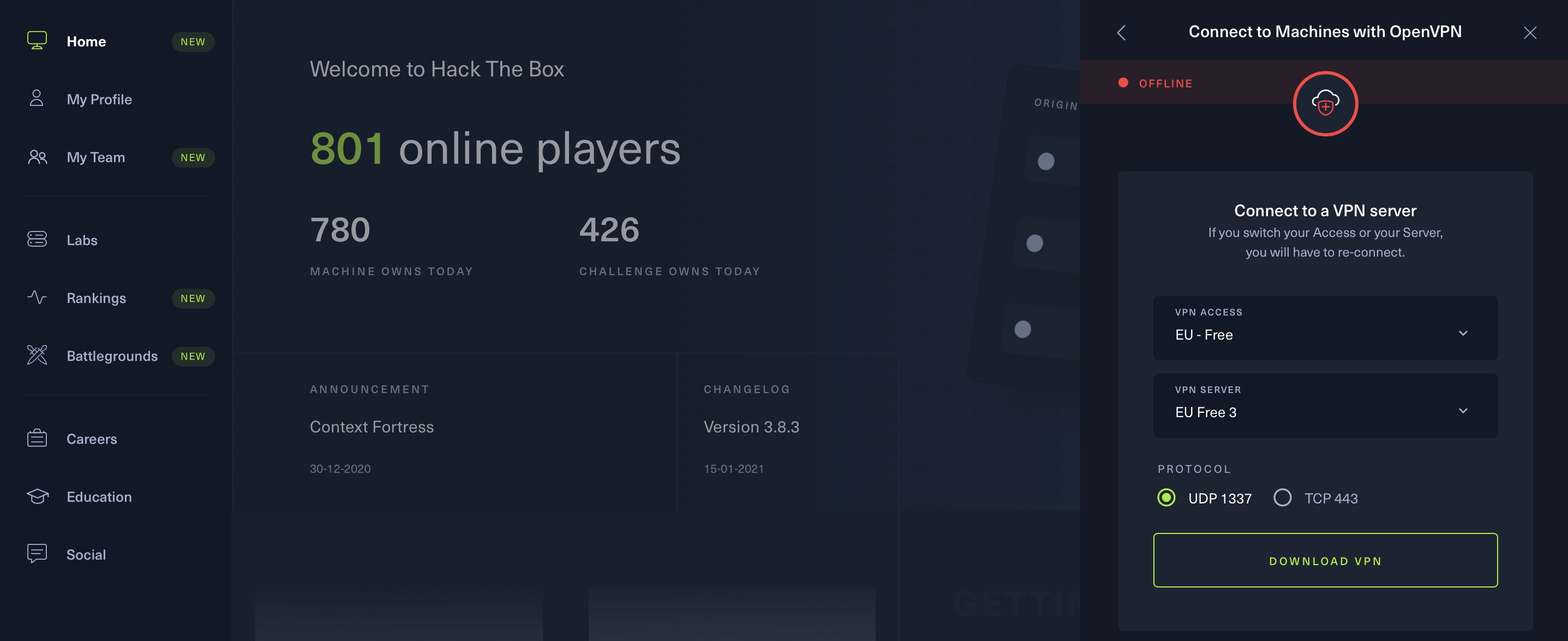 Pour changer de serveur VPN, rendez-vous sur HackTheBox, cliquez sur l’icône en haut à droite intitulée « Accès au labo » ou « Hors ligne », puis sur « Labos » et enfin sur « OpenVPN ». Vous pourrez alors choisir l’emplacement de votre serveur VPN et sélectionner un serveur parmi ceux disponibles dans cette région.