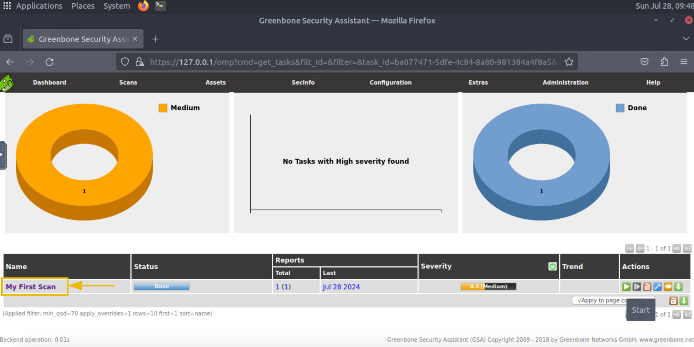 L’analyse prendra quelques minutes. Une fois terminée, son statut affichera « Terminé ». Les visualisations du tableau de bord Tâches indiqueront la gravité des vulnérabilités détectées. Pour consulter les détails de l’analyse, cliquez sur le nom de la tâche.