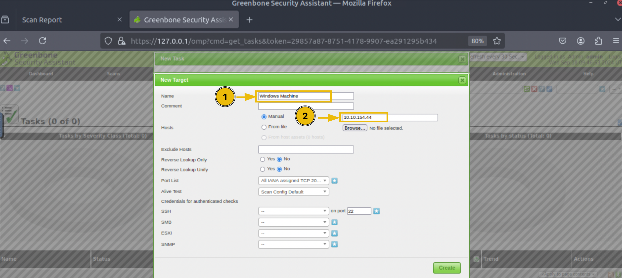 Nous allons maintenant effectuer une analyse de vulnérabilités sur une machine. La première étape consiste à créer une tâche dans le tableau de bord OpenVAS. Renseignez les détails de cette tâche et exécutez-la pour lancer l’analyse.